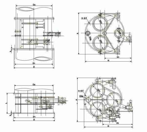阀组型号 | D | D1 | L | b | n-Φd | A | A1 | H | H1 | 阀门配制 | 许用流量(m3/h) | 重量(kg) | 对应管道 |